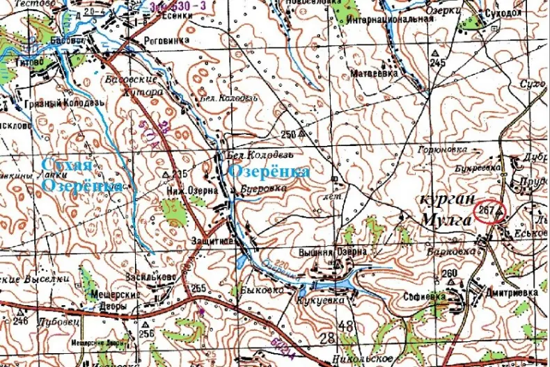 автор: А. КуркулевВплоть до 1680-х годов земли левобережья среднего и верхнего течения реки Рати не были заселены, несмотря на их формальную принадлежность к Курскому уезду. Это объясняется тем, что восточнее Рати, по Тимско-Щигровской гряде, разделяющей бассейны Дона и Оки, пролегал один из маршрутов набегов крымских татар на Русское государства - Пахнутцева дорога. Эта гряда служила своеобразным коридором для вторжений, делая освоение прилегающих территорий крайне рискованным. Речка Озерёнка, ранее известная как Озёрна, является левым и самым протяжённым притоком реки Рати, её длина превышает 22 километра. Исток Озерёнки находится на западных склонах Тимско-Щигровской гряды, вблизи современной деревни Барковка Тимского района, недалеко от высоты с абсолютной высотой 267 метров. В XVII столетии эта высота была известна как курган Мулга.