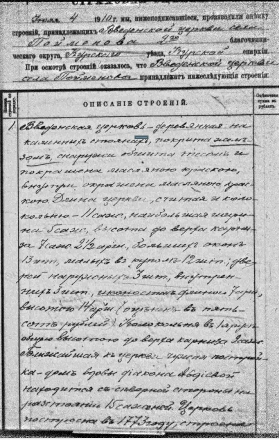 ВВЕДЕНСКАЯ ЦЕРКОВЬ В СЕЛЕ ПОЙМЕНОВО КУРСКОГО УЕЗДА ПО МАТЕРИАЛАМ СТРАХОВОЙ ОЦЕНКИ ОТ ПОЖАРОВ 1910 ГОДА |