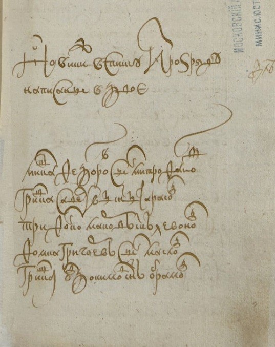 Л. 313 Куреск Новики, которые с Москвы съехали и которые в списку из Розряду написаны вдвое. Ульянко Офонасьев сын Волков Власко Иванов сын Мухин Мишка Федоров сын Митрофанов Л. 313об. Митрошка Иванов сын Малыгин Гришка Савельев сын Тарасов Трифонко Марков сын Левонов Ефимко Иванов сын Ефремов Л. 314 Гришка Овдокимов сын Аврамов Максимко Якимов сын Басов Трофимко Якимов сын Басов Филимонко Васильев сын Григорьев Федька Григорьев сын Титов Л. 314об. Изосимко Тимофеев сын Жиров Тимошка Иванов сын Кореев Офонка Дмитриев сын Глушков Ивашко Федоров сын Катырев Л. 315 Микитко Омельянов сын Сабельников Микитка Офонасьев сын Домашнев Микитка Офонасьев сын Машкин Офремко Петров сын Парфеньев Филька Петров сын Парфенов Л. 315об. Ондрюшка Васильев сын Конорев Микитка Федоров сын Конарев Архипко Олексеев сын Писколов Мартын Петров сын Ярово Л. 316 Сидорко Федоров сын Захаров Микифорко Родионов сын Маслов Сенька Федюкин Офонька Перфильев сын Мальцов Степанко Тимофеев сын Давыдов Л. 316об. Савостьян Михайлов сын Козюькин Ивашко Степанов сын Борзенок Лукьянко Гарасимов сын Ванин Федька Матфеев сын Лазовской Л. 317 Ивашко Михайлов сын Иванов Офонка Дементьев сын Волобоев Стешка Григорьев сын Колугин Фомка Родионов сын Сергеев Трофимко Сидоров сын Ноздрин Л. 317об. Кондрашко Зиновьев сын Писколов Обрамко Иванов сын Волобуев Игнашко Наумов сын Булгаков Микитка Захарьев сын Микулин Л. 318 Панка Поликарпов сын Мокнев? Микитка Лукин сын Елагин Овдокимко Тимофеев сын Мезинцов Филька Иванов сын Скобелев Ивашко Федоров сын Белой Л. 318об. Ондрюшко Миронов сын Чюлков Ивашко Микифоров сын Омельянов Ларка Ефимов сын Сибилев Степанко Васильев сын Чюлков Л. 319 Васко Михайлов сын Захаров Павелко Григорьев сын Гуторев Осташко Иванов сын Семенов Гришка Петров сын Яковлев Демко Иванов сын Филипской Л. 319об. Онтонко Лукьянов сын Клесов Офонка Иванов сын Белозеров Васька Степанов сын Березовской Гаврилко Федоров сын Ивонин Л. 320 Ивашко Игнатьев сын Тарасов Федотко Левонтьев сын Беревской Филимонко Яковлев сын Деев Данилко Свиридов сын Струков Онисимко Лукьянов сын Овдакимов Л. 320об. Сенько Онтипов сын Толмачов Федька Матвеев сын Окулов Кондрашко Гаврилов сын Мартынов Филька Васильев сын Дремов Л. 321 Тимошка Олексеев сын Олябьев Кондрашко Григорьев сын Мартынов Ульянко Офонасьев сын Волков Власко Иванов сын Мухин Сенька Васильев сын Звягинцов Л. 321об. Михалко Иванов сын Мелехов Кирюшка Онтипов сын Толмачов Сенько Онтипов сын Толмачов Федька Федоров сын Горбатой Л. 322 Мирошка Иванов сын Молыгин Мишка Федоров сын Митрофанов Максимко Якимов сын Басов Филька Петров сын Парфенов Ондрюшко Васильев сын Конарев Л. 322 об. Микитка Федоров сын Комарев Архипко Олексеев сын Писклов Степанко Тимофеев сын Давыдов Федотко Левонтьев сын Березовской Л. 323 Филька Тимофеев сын Мальцов Ортюшка Сысоев сын Филипской Максимко Лукьянов сын Головин Парфенко Гаврилов сын Розинков Л. 323 об. Федька Иванов сын Хлыков Ларка Тимофеев сын Филатов Федько Федоров сын Колугин Первушка Федоров сын Шеховцов Ерошка Онтипов сын Толмачов