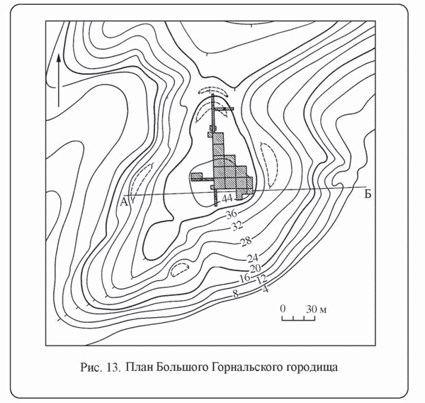 © автор: В.В. ЕНУКОВГлава 2. Материальная культура населения Посемья2.2. ГородищаОпределение границ Посемья позволяет нам оперировать количественными показателями при характеристике памятников, среди которых выделяется три основных типа: городища, неукрепленные поселения и древние кладбища, представленные главным образом курганами. На территории Посемья известно 59 городищ, которые располагаются следующим образом: на Сейме с мелкими притоками (Рать и Курица) – 22, Тускаре – 5, Свапе с Усожей – 12 и на Псле – 20. В подавляющем большинстве случаев площадь их невелика (рис. 12). Для расчетов оказались пригодными 49 памятников, так как для ряда городищ установить первоначальные размеры не представляется возможным, главным образом из-за значительных повреждений. Площадь 82 % городищ не превышает 0,5 га, а памятники площадью более 1 га вообще единичны. К их числу относятся Мухино (1,1 га) и Старый Город (2 га) на Свапе, Гора Ивана Рыльского (2 га) на Сейме, а также Курское городище, площадь которого, по некоторым данным, которые будут рассмотрены ниже, превышала 3 га. Укрепленные поселения, как правило, располагались на мысах, образованных либо при впадении в реки небольших притоков, либо при выходе в пойму балок и оврагов (рис. 13–14). Очень часто они отстраивались на месте поселков раннего железного века. Отклонения от топографического “стандарта” редки. Только в четырех случаях городища размещались на останцах (Гора Ивана Рыльского, Банище и Коробкино на Сейме, Красный курган на Свапе) (рис. 15). Общим для обоих типов является выбор, как правило, таких условий, при которых доступ к площадкам городищ был весьма затруднен особенностями рельефа или ландшафта. Помимо этого достаточно показательным параметром является высота над уровнем воды. Сразу оговоримся, что городищенские площадки нередко имели заметный уклон в сторону водоема, поэтому за точку отсчета бралась самая нижняя, как правило, расположенная в крайней мысовой части. В целом высоты городищ варьируют от 5-6 (Коробкино, Жидеево) до 60 м (Кудеярова гора), однако примеры подобного рода представляют собой крайние границы колебаний. Чаще всего при строительстве городищ выбирались площадки на высоте от 10 до 30 м (две трети всех случаев). Укрепленные поселения на отметках свыше 40 м являются редкими (Большое Горнальское, Фагор, Дроняево, Мешково), а свыше 50 м располагалась только площадка Кудеяровой горы.