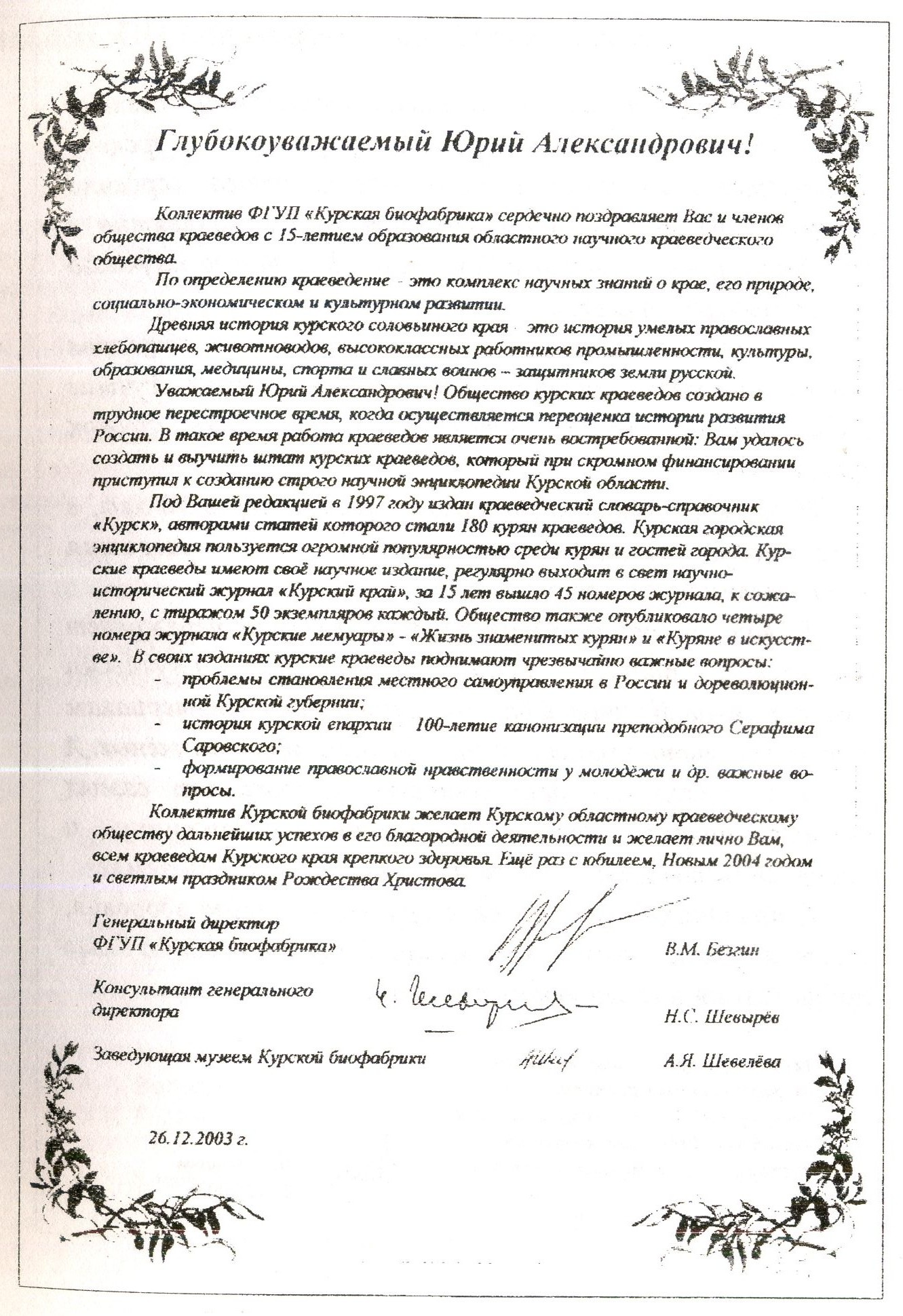 автор: А.Н. Манжосов26 декабря 2003 года в Большом зале областной научной библиотеки им. Н.Н. Асеева собралось более 150 человек ученых-историков, литераторов КГУ, КГТУ, КГСХА, ветеранов архивного дела, сотрудников Курского областного краеведческого музея, музея «Юные защитники Родины», краеведов, сотрудников городских библиотек, аспирантов, воспитанников Дома детского творчества Железнодорожного округа г. Курска и других друзей Курского областного научного краеведческого общества. Собравшиеся краеведы и гости тепло и сердечно говорили о 15-летии краеведческого общества, созданного 16 декабря 1988 года на учредительной конференции. За годы существования членами общества была проделана огромная исследовательская, организаторская, научная и научно-просветительская работы. Из печати выпущено 50 номеров научно-исторического журнала «Курский край» (в числе его авторов выступили более 120 ученых-историков, аспирантов, краеведов Курска, Москвы, Санкт-Петербурга, Нижнего Новгорода, Киева, Белгорода, Воронежа), осуществлено издание серий «Курские мемуары» (2002-2003 гг.), «Куряне в искусстве» (1998-2002), «Жизнь знаменитых курян» (1999-2003) и др. При активном участии курских краеведов изданы книги по истории культуры Курского края XVI1I-XX вв. (трилогия Ю.А. Бугрова «Свет курских рамп», (1995-2002)), о боевых и трудовых традициях коллектива железнодорожников Курского отделения Московской ж.д. (серия «Этапы большого пути» под ред. А.Н. Манжосова (1991-1997), о 40-летней трудовой деятельности коллектива ПО «Прибор» (Ю.А. Бугров «Славное 40-летие, 1999), к 50-летнему юбилею ПО «Электроагрегат» (Энергия созидания, 2003, ред.-сост. Т.А. Грива), о 200-летней истории Курской гидрометеорологической службы (В.В. Потапов «Гидрометеослужба Курского края, 2003 г.), по истории Курской епархии (Ю.А. Бугров, «История Курской епархии, 2003). Члены общества активно сотрудничали с докт. ист. наук, проф. А.Ю. Друговской по выходу в свет книг «История Великой Отечественной войны в документах и судьбах» (1995), «Курск. Документы. Статьи. Воспоминания» (1998), «Человеческие документы войны» (1998), «У победы есть имена» (1998), «Война и женская судьба» (2000) и других изданий. В 1991-2003 гг. члены Совета Курского областного краеведческого общества А.Н. Манжосов, В.В. Коровин, Н.А. Постников участвовали в подготовке и проведении мероприятий в честь 50-ти и 60-летия обороны Курска (1991 и 1996, 50-летия, 55-летия и 60-летия Курской битвы (1993-2003) и других памятных дат военной истории России. Совместно с центром «Поиск» постоянно проводится работа по восстановлению имен безымянных солдат Великой Отечественной. С участием членов общества краеведов в 1993-2003 в Курске из печати вышли 14 томов Книги Памяти. C 1998 по 2003 гг. члены общества и его Совета защитили 3 докторских (З.Д. Ильина, Г.А. Салтык, К.В. Яценко) и 7 кандидатских (А.Н. Манжосов, В.В,, Коровин, Л.А. Кузнецова, В.В. Потапов, В.Н. Письменов, С.С. Жиров, А.И. Раздорский) диссертаций по специальности «Отечественная история». Первым со словами приветствия к собравшимся обратился глава администрации города Курска Виктор Петрович Суржиков. В своей речи он указал, что работа по воспитанию подрастающего поколения на героических воинских, славных культурных традициях есть основа в движении любого цивилизованного общества к новым свершениям. В.П. Суржиков вручил одному из основателей общества, кандидату историческ