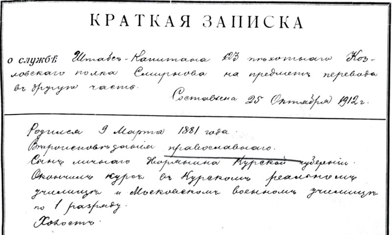 На Херсонском кладбище Курска сохранились 4 захоронения воинов, погибших в Первой мировой войне... Надгробие в виде аналоя капитану 173-го пехотного Каменецкого полка Павлу Васильевичу Смирнову. На изображенном Евангелии высечена надпись: «Больши сея любве никтоже имать да кто душу свою положит за други своя». Из краткой записки о службе штабс-капитана 123-го Козловского полка Смирнова на предмет перевода его в другую часть, составлен- ной 25 октября 1912 г., следует, что родился он 9 марта 1881 года, вероисповедания православного. «Сын личного дворянина Курской губернии. Окончил курс в Курском реальном училище и Московском военном училище по 1 разряду. Холост. Получает в год жалованья 780 руб., добавочных – 300 руб., квартирных – по положению.