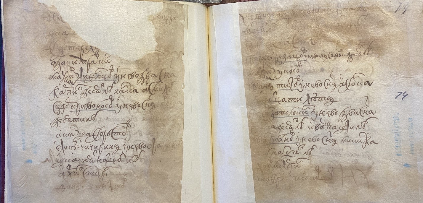 (Л. 72) Стрельцы Пятидесятник Фома? Юдин. У него пять сынов: Гришка пятнатцати лет, Венедитка тринатцати лет, Микулка десяти лет, Сенька семи лет, Гаврилка пети лет. Игнат Лыков Третьяк Пиминов. У нево сын Богдашка тринатцати лет. Дементей Рыболов. У нево два сына Гришка? пятнатцати лет, Никитка? четырех лет. (Л. 72об.) Ермол……………У нево сын Афонька асми лет. Аксен Микифоров Семен Барисов Василей Ловлин. У нево брат Федотка петнатцати лет. Харитон Кановалов Федор Спицын. У нево брат Петрушка дватцати лет. Денис Кузнецов. У нево три брата: Максимка тритцати лет, Андрюшка дватцати лет, Ермошка десяти лет. (Л. 73) Авдей ……………….. Василей …………….. У нево сын Степка пятнатцати лет. Петр Травкин. У нево сын Петрушка десяти лет. Микифор Майков. У нево два сына: Бориска двенатцати лет, Селиверстка трех лет. Иван Зазерин Тимофей Губин. У нево два брата Ивашка дватцати лет, Петрушка пятнатцати лет. (Л. 73 об.) Нестер? ………… У нево сын Кондрашка Федор Терехов Алдаким Травкин Максим Лифинцов. У нево два сына: Карпик десяти лет, Панка асми лет. Сидор Кривоносов. У нево сын Евсейка десяти лет. Акимша Форостов Елисей Чичирин. У нево брат Ивашка пятнатцати лет. Архип Спицын Давыд Шернышов (Л. 74) Яков Васильев. У нево три сына: Лука петнатцати лет, Авдейка двунатцати лет, Федька сми лет. Григорей Резанцов. У нево сын Самошка десяти лет. Максим Уколов. Иван Титов. У нево сын Афонька пятнатцати лет. Федор Затолокин. У нево два сына: Стенька десяти лет, Ивашка шти лет. Иван Губанов. У нево сын Микитка пятнатцати лет. Яков Молюгин Анофрей Плотавцов (Л. 74об.) Михайла Собынин. У нево два сына: Савка пятнатцати лет, Николка асми лет. Терех Такорев Иван Зубов. Сын у нево Ивашка двенатцати лет. Микита Рябой Василей Белой Яков Маслеников Василей Барисов (Л. 75) Степан? Шафоростов? У нево сын…….. шти лет. Василей Симонов. У нево сын Ивашка семи лет. Давыд Желудкев. У нево сын Сидорка семи лет, да зять Родька дватцати лет. Савелей Карпов. У нево сын Мишка семи лет. Кондрат Портной Савелей Сурядной Микифор Дворяшин. Сын у нево Филимошка семи лет. (Л. 75об.) Сафон Гутенев. У нево сын Афонька асми лет. Иван Девятнин. У нево два сына: Исайка десяти лет, Стенька асми лет. Пятидесятник Федор Семенов. У нево два сына: Бориска дватцати лет, Петрушка десяти лет. Козма Сошников. У нево брат Мелешка пятнатцати лет. Петр Широкой Гаврила Окиншин Сергей Кудашов (Л. 76) Гаврила Михайлов Захар Бузанов Пинай Первыханов Савостьян Белозеров Мина Колосов. У нево сын Гришка дватцати лет. Павел Ерпылев. У нево два сына: Тимошка асми лет, Данилка шти лет. Тимофей Павлов Иван Сушков Сергей Зверев (76 об.) Иван Духанин. У нево два сына: Анашка шеснатцати лет, Ивашка тринатцати лет. Артем Седой Федор Варашилин. У нево зять Олфимка дватцати лет. Игнат Недорезав. У нево сын Нефедка асми лет. Устин Чюрсин. Сын Степка асми лет. Ерофей Чюрсин. У нево брат Пронька пятнатцати лет. (Л. 77) Прокофей Салков. У нево сын Кирюшка пятнатцати лет. Федот Еремин. У нево два брата: Левка асми лет, Мишка шти лет. Микифор Кудрявцов Михайла Кулабухов Тимофей Гневов. У нево два сына: Степка десяти лет, Лучка асми лет. Карп Силин Матвей Насков Семен Федорыкин Иван Голенцов Иван Шилдав (Л. 77об.) Иван Кистинев? У нево брат Серешка? пятнатцати лет. Устин Долгой. У нево сын Васька? пяти лет. Ларя Абакумов. У нево два сына: Максимка десяти лет, Абрамка семи лет. Василей Андросо