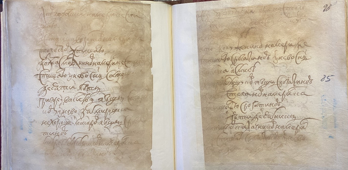 (л. 80) Казаки Пятидесятник Калина Хрептов на мерине с пищалью с рогатиною. У нево сын Елизарка семнатцати лет. Савостьян Бедной на меринке с пищалью с рогатиною. У нево племянник Кирюшка десяти лет. Иван Меховицкой на меринке с топорком с пищалью. Сила Медынцов. Пеш с топорком. Фома Демин на меринке с пищалью с рогатиною. (л. 80об.) Андрей Олтухов на меринке с пищалью с рогатиною. У нево племянник Федоска дватцати лет. Иван Мицкой на меринке с пищалью с рогатиною. У нево сын Васька асми лет. Терентей Кузовлев на меринке с пищалью с топорком. Савелей Хрипков на меринке с пищалью с рогатиною. Архип Федоров на меринке с рогатиною с пищалью. (л. 81) ……………………………………. у нево сын Кузька девяти лет. Игнат Черников на меринке с пищалью с рогатиною. У нево сын Ивашка пятнатцати лет. Василей меньшой Халезев на меринке с пищалью с рогатиною. Осип Косой пеш с пищалью с рогатиною. У нево сын Филимошка десяти лет. Тихан Черной пеш с пищалью с топорком. Григорей? Сотаров на меринке с рогатиною с пищалью. (Л. 81об.) Ефим Арефьев на меринке с пищалью с рогатиною. Гаврила Бабанин на меринке с рогатиною с пищалью. Федор Лешуков на меринке с пищалью с рогатирою. Порфен Торасов пеш с топорком. Козма Останков на меринке с пищалью с рогатиною. У нево сын Савка пятнатцати лет. Семен Маликов на меринке с пищалью с рогатиною. У нево сын Ивашка тринатцати лет. (Л. 82.) Захар Дехтерев на меринке с пищалью с рогатиною. У нево зять Парфушка? Евтифей Костяев на меринке с пищалью с рогатиною. У нево сын Петрушка шти лет. Роман Силин на меринке с топорком с пищалью. У нево брат Ефимка тринатцати лет. Нифон Рощупкин на меринке с топорком с пищалью. У нево брат Ивашка десяти лет. Яков Карцов на меринке с топорком с пищалью. (Л. 82об.) Иван Казлитинов на меринке с пищалью с рогатиною. У нево сын Микишка десяти лет. Василей Зуборев пеш с топорком. У нево два сына Ивашка асми лет, Кирюшка шти лет. Лукьян Лохтионов на меринке с топорком с рогатиною. У нево сын Олфимка асми лет. Василей Осимов На меринке с пищалью с топорком. У нево сын Микишка десяти лет. Андрей Кулаков на меринке с топорком с пищалью. У нево сын Юрка? тринатцати лет. (л. 83) Денис Дягилев? пеш с топорком. Семен Черной? на меринке с пищалью с рогатиною. Иван Щуров на меринке с топорком с пищалью. У нево сын Мишка десяти лет. Володимер Бочаров пеш с рогатиною. Полуехт Тарубаров на меринке с топорком с пищалью. Василей Огарков на меринке с топорком с пищалью. Трифон Костяев на меринке с топорком с пищалью. У нево сын Кирющка десяти лет. (Л. 83об.) Иван Погожей на меринке с пищалью с рогатиною. У нево брат Ефимка пятнатцати лет. Свирид Тотаринов пеш с топорком Барис Белобород на меринке с пищалью с рогатиною. Ермол Боравов на меринке с пищалью с рогатиною. У нево зять Гришка. Воин Кулаков на меринке с пищалью с рогатиною. Иван Голенцов на меринке с пищалью с топорком. (Л. 84) Потап Иванов на меринке с пищалью с рогатиною. У нево сын Уварка? десяти лет Селуян Колуженин пеш с рогатиною. Федор Кривчиков на меринке с топорком с пищалью. У нево пасынок Елистратка? дватцати лет. Иван Бахмат на меринке с пищалью с рогатиною. У нево два сына Филатка семнатцати лет. Ивашка одиннатцати лет. Михайла Юсов на меринке с топорком с пищалью. У нево брат Гришка пятнатцати лет. (Л. 84об.) Яков Побаскин на меринке с пищалью. Афонасей Шафоростов на меринке с топорком с пищалью. Коз