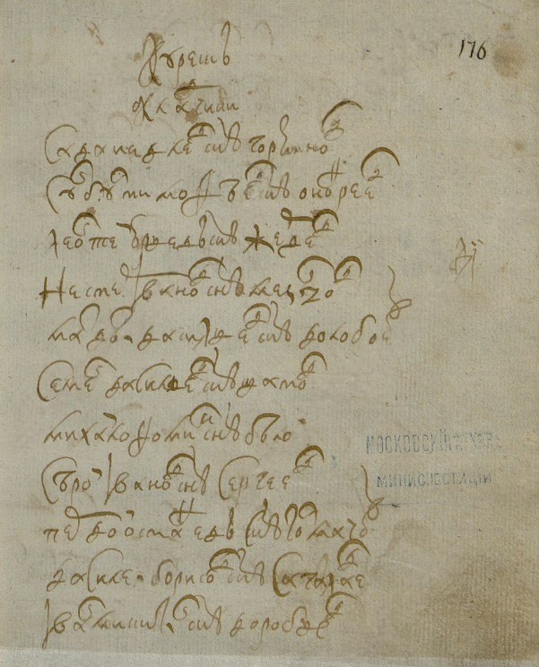 Верстальная десятня курчан детей боярских Л. 176 Куреск Окладчики: Сава Иевлев сын Горяинов Сунбул Тимофеев сын Онофреев Леонтей Юрьев сын Жердев Нестер Иванов сын Мезенцов Матвей Васильев сын Волобоев Семен Васильев сын Шатов Михайло Фомин сын Белой Серой Иванов сын Сергеев Первой Остафьев сын Толмачов Василей Борисов сын Сагалаев Иван Микитин сын Воробьев Л. 176об. Василей Дмитриев сын Ноздрецов Филип Иванов сын Костин Офонасей Федоров сын Розинков Юрьи Микитин сын Шумаков Прокофей Тимофеев сын Чаплыгин Михайло Фомин сын Белой Новики служилые 1-й статьи По 200 чети, денег з городом по 6 рублев Ортемей Васильев сын Быканов, окладчики про него сказали: отец умер, братьи меньшой нет, брат большой служит, поместье Л. 177 отцовское з братом, да с племянником Софонкою 100 чети, а он служит четыре годы. Тимофей Микифоров сын Маслов, окладчики про него сказали: отец умер, брат меньшой Марко 14 лет, поместья отцовского за ними 60 чети, служит два года. Тихан Леонтьев сын Расенской, окладчики про него сказали: отец умер, братьи нет, отцовского поместья за ним 80 чети, служит пять лет. Л. 177об. Тимофей Олексеев сын Олябьев, окладчики про него сказали: отец служит, брат меньшой Ивашко 14 лет, поместья за ним 63 чети в отводе, служит 4 годы. Гаврило Спиридонов сын Чернышов, окладчики сказали: братьи и поместья за ним нет. Игнатей Наумов сын Булгаков, окладчики про него сказали: отец умер, брат меньшой Янка 7 лет, поместья за ним отцовского 100 чети, служит пять лет. Офрем Петров сын Каменев, окладчики про него сказали, отец умер, брат меньшой Гришка 10 лет, поместья отцовского за ним з братом 300 чети, служит давно. Л. 178 Онтон Федоров сын Ползиков, окладчики про него сказали: отец умер, брат большой служит, поместья отцовского за братом 60 чети, а за ним поместья нет. Фома Григорьев сын Маслов, окладчики про него сказали: отец умер, братьи нет, поместья отцовского за ним 80 чети. Михайло Исаев сын Крюков, окладчики про него сказали: отец умер, два брата больших служат, поместья отцовского за ними 100 чети. Офонасей Гаврилов сын Быканов, окладчики про него сказали: отец умер, братьи нет, отцовского за ним поместья с матерью 200 чети. Л. 178об. Иван Офонасьев сын Машкин, окладчики про него сказали: отец постригся, брат меньшой Корнилко 14 лет, поместья отцовского за ним з братом 125 чети. Семен Андреев сын Анненков, окладчики про него сказали: отец умер, братьи и поместья нет. Игнатей Иванов сын Родионов: окладчики про него сказали: отец умер, три брата меньших: Федька 8 лет, Савка 5 лет, Филька 3-х лет, поместья отцовского за ними 120 чети. Ондрей Власов сын Лахтионов, окладчики про него сказали: отец умер, братьи меньшой нет, поместья отцовского з братом з большим 100 чети. Л. 179 Тарас Мосеев сын Михайлов, окладчики про него сказали: отец умер, братьи и поместья у него нет. Офонасей Васильев сын Молыхин, окладчики про него сказали: отец умер, поместья отцовского за двумя браты 200 чети, а брат служит. Добрыня Ларионов сын Офонасьев, окладчики про нево сказали: отец умер, братьи нет, поместья за ним 60 чети с осминою. Потап Мартынов сын Дурнев, окладчики про него сказали: отец умер, брат большой Онисимко служит, поместья за ними за тремя братьями отцовского 100 чети. Л. 179об. Парфен Яковлев сын Перков, окладчики про него сказали: отец умер, братьи и поместья нет. Семен Тимофеев сын Наумов, окладчики про него сказали: