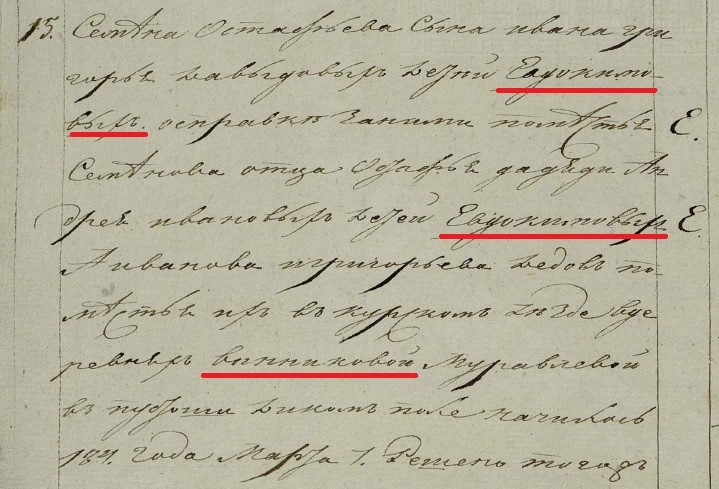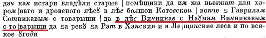 Позднее, когда сыновья Милентея Винникова поспели к службе, его старший сын Пахом был поверстан "в припуск", и ему отошло отцовское поместье в деревне Винниковой. А младшему сыну - Никифору был назначен поместный оклад "в отвод", ему были выделены земли в верховьях реки Рати в деревне Крутой. ЕВДОКИМОВЫВ отличие от Винниковых, фамилия служилых людей Евдокимовых (или как она тогда писалось - Овдокимовых) довольно часто встречается в сохранившихся документах Курского уезда первой половины XVII века. Родоначальниками винниковского рода Евдокимовых являются Мина (Минай) и Яков Лукьяновы дети Евдокимовы, которые в первой половине XVII века имели поместные земли в д. Мецнянкина на р. Сейм, в д. Шеховцова на р. Обмять, в д. Муравлевой в низовьях р. Виногробли и лесные угодья в верховьях этой реки, в Винниковом лесу. 7 марта 1676 года их внуки подают челобитную царю Федору Алексеевичу "о справке за ними дедов их поместья в Курском уезде в деревнях Винниковой и Муравлевой". Это самый ранний из найденных документов в котором упоминается деревня Винниково. [9]
