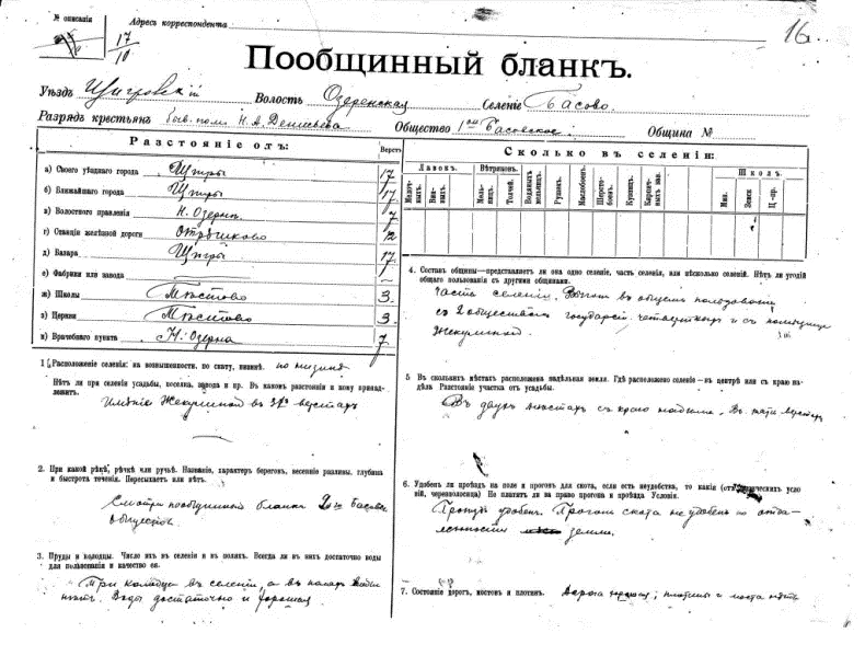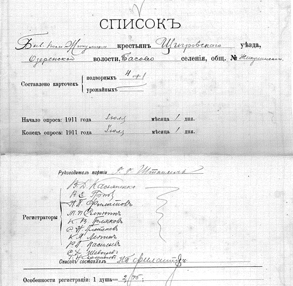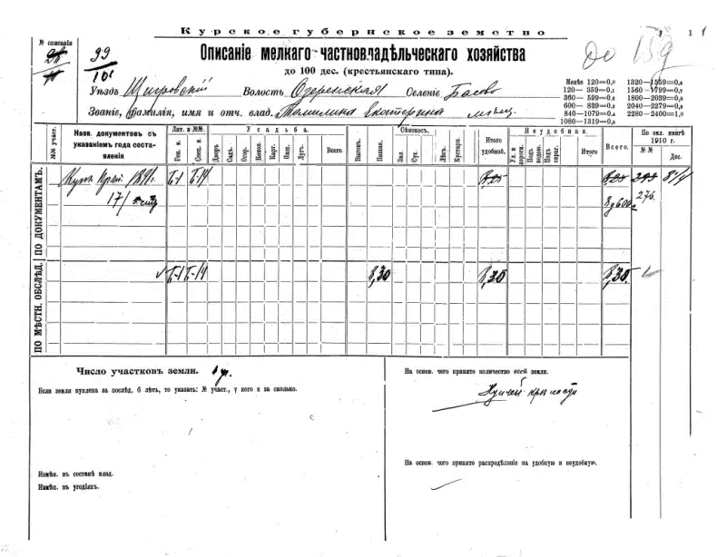 НЕКОТОРЫЕ СТАТИСТИЧЕСКИЕ СВЕДЕНИЯ О ДЕРЕВНЕ БАСОВО ОЗЕРЕНСКОЙ ВОЛОСТИ ЩИГРОВСКОГО УЕЗДА, ПОЛУЧЕННЫЕ В ХОДЕ СЕЛЬСКОХОЗЯЙСТВЕННОЙ ПЕРЕПИСИ 1911 ГОДА |