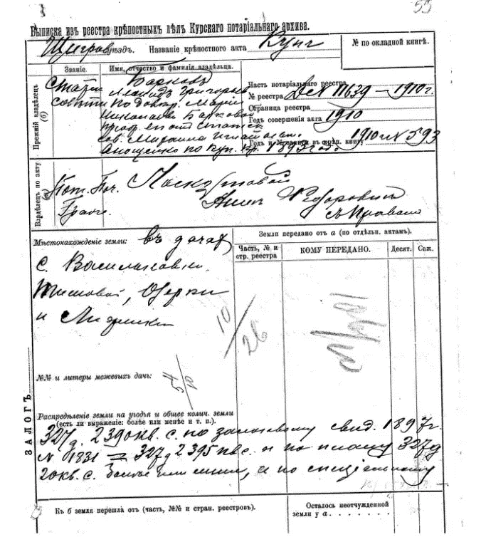 Купленное Лоскутовой поместье было полноценной экономией – так в то время в России называли хозяйство фермерского типа, ведущееся с использованием передовых агротехнических приемов и наемного труда. Кроме каменного, крытого железом, хозяйского дома размером 26 х 14,5 аршин на подворье имелись деревянные, крытые соломой, хозпостройки: управленческая контора, две конюшни, коровник, свинарник, птичник, амбары для зерна. В хозяйстве применялась система трехпольного земледелия. На участке, отведенном под озимые культуры, культивировались рожь и пшеница, в то время как на яровом поле выращивалось множество различных культур. Помимо овса, гречихи и проса, присутствовали посевы гороха, картофеля, кормовой свеклы, тыквы, кукурузы, подсолнечника, конопли, а также посевные травы, такие как вика и клевер. Сад и огород обеспечивали семью Лоскутовых необходимыми продуктами, а часть урожая шла на реализацию. В хозяйстве успешно разводили лошадей, имелось 6 племенных, 4 выездных и около 40 рабочих особей. Стадо крупного рогатого скота включало 10 волов, племенного быка, 14 дойных коров, и около двадцати голов молодняка. В свинарнике содержалось 6 взрослых свиней и 19 поросят. Управлял хозяйством наемный управляющий, мещанин Яков Григорьевич Волчанский. Он следил за соблюдением агротехнических правил, контролировал работу наемных рабочих и вел учет доходов и расходов. Из постоянных рабочих, нанимаемых в основном из деревни Басово, присутствовали: староста, сторож, десять полевых рабочих (мужчины), пастух, два подпаска, два конюха, доярка и птичница. В случае необходимости привлекались временные рабочие, а на периоды сбора урожая и сенокоса – сезонные работники. Продукция экономии Лоскутовой пользовалась спросом на местном рынке. Зерно, молоко, мясо, овощи и фрукты поставлялись в Курск, Щигры и другие города. Хозяйство приносило стабильный доход, позволяя Анне Федоровне вести светский образ жизни и заниматься благотворительностью. Представленные статистические сведения о деревне Басово, собранные в ходе сельскохозяйственной переписи 1911 года, позволяют получить ценную информацию о социально-экономическом положении крестьянских и частновладельческих хозяйств в начале XX века, их специализации, уровне технической оснащенности и демографической структуре. Эти данные являются важным источником для изучения аграрных отношений истории Щигровского уезда Курской губернии. ИСТОЧНИКИ:1. ГАКО, Ф. 4, Оп. 1, Д. 464 1. ГАКО, Ф. 4, Оп. 1, Д. 1069 2. ГАКО, Ф. 4, Оп. 1, Д. 1148 3. ГАКО, Ф. 4, Оп. 1, Д. 1610 Ваш комментарий: |