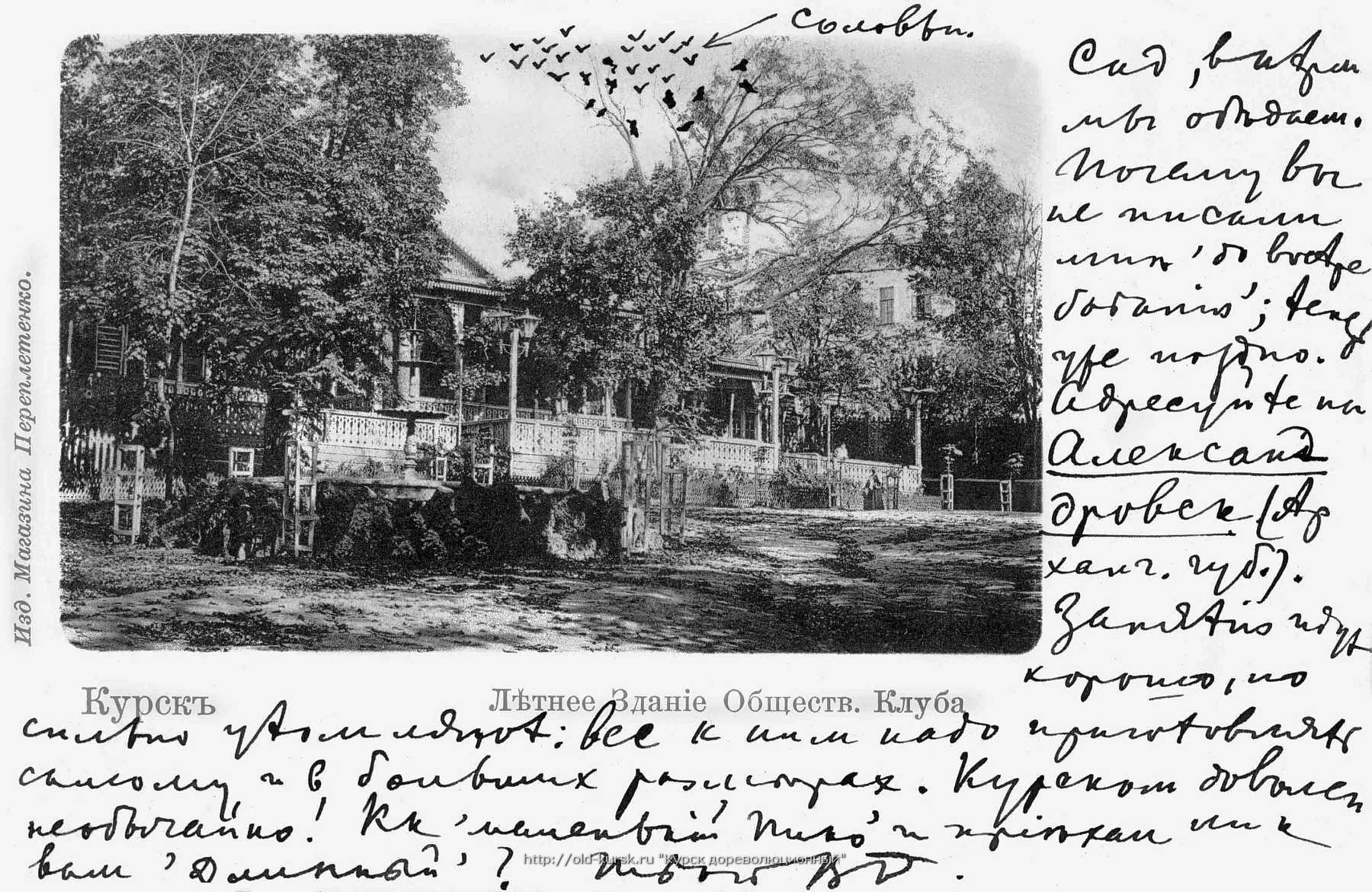 Летнее здание обществ. клуба.Сев.- вост. угол Лазаретного сада. Перед клубом фонтан. Справа сквозь деревья видна земская больница на углу Садовой и Семеновской