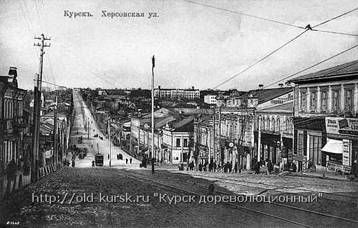 В 7268 Херсонская ул.Полугора сверху. Справа магазин галантереи и церковной утвари В.Н. Дружинина в собственном доме и там же магазин табака, чая, писчебумажных товаров С.Ш. Карабаджака. Ниже дом купца Ф.И. Озерова с собственным магазином бакалеи и обоев и электрическим театром (кино) "Био" на 2-м этаже. Еще ниже, на зап. углу Ендовищенской, номера и ресторан П.И. Гребенникова в доме Н.А. Крепоносовой и Н.Н. Маслова. Вдали духовная семинария на Театральной и, правее, казенная палата на Ртищевской. Слева на горизонте казармы