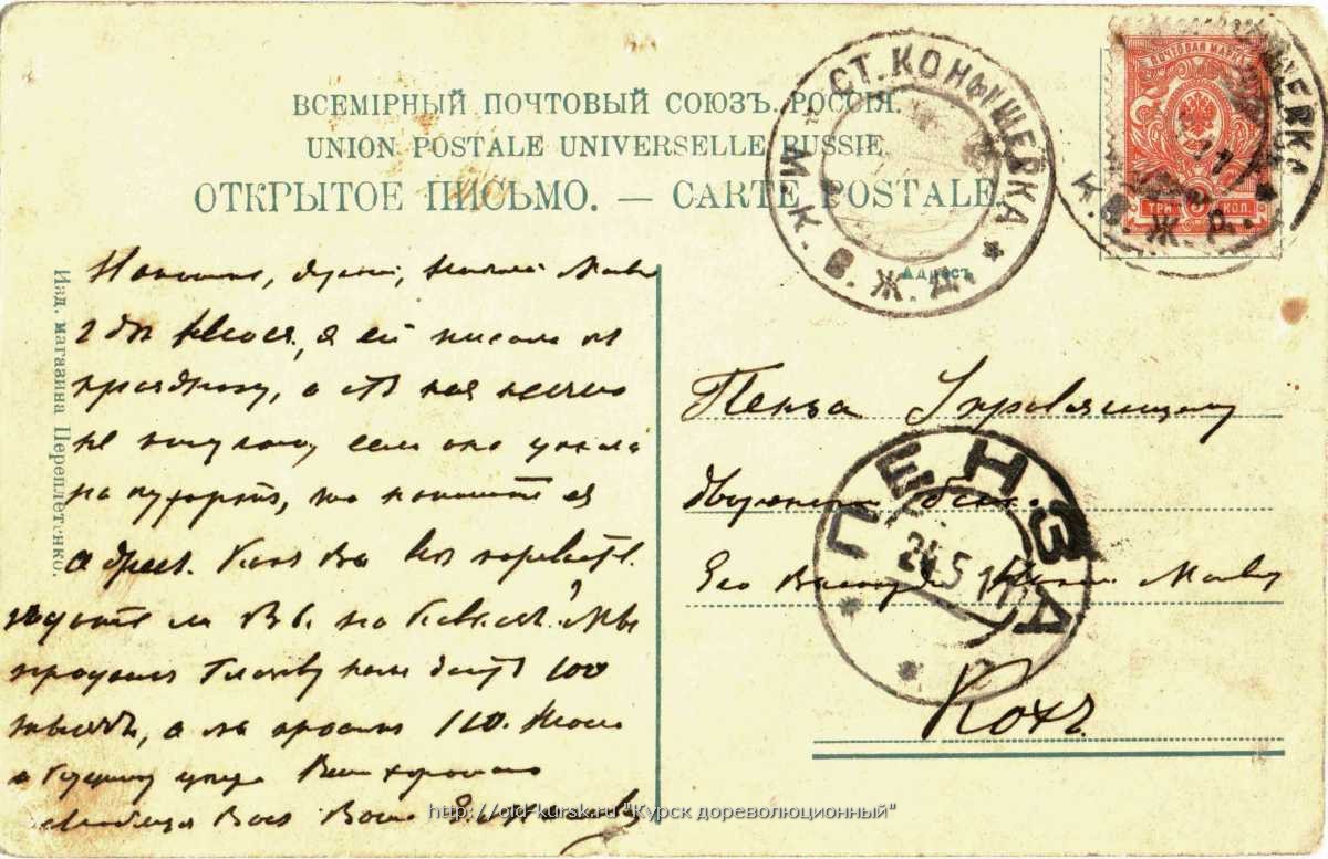 Магазин Переплетенко. Курск. Штемпель 1910 г. Изд. номера общего счета четырехзначные с литерой "В" , проставлены мелко в одном из нижних углов. Кр./ зел.