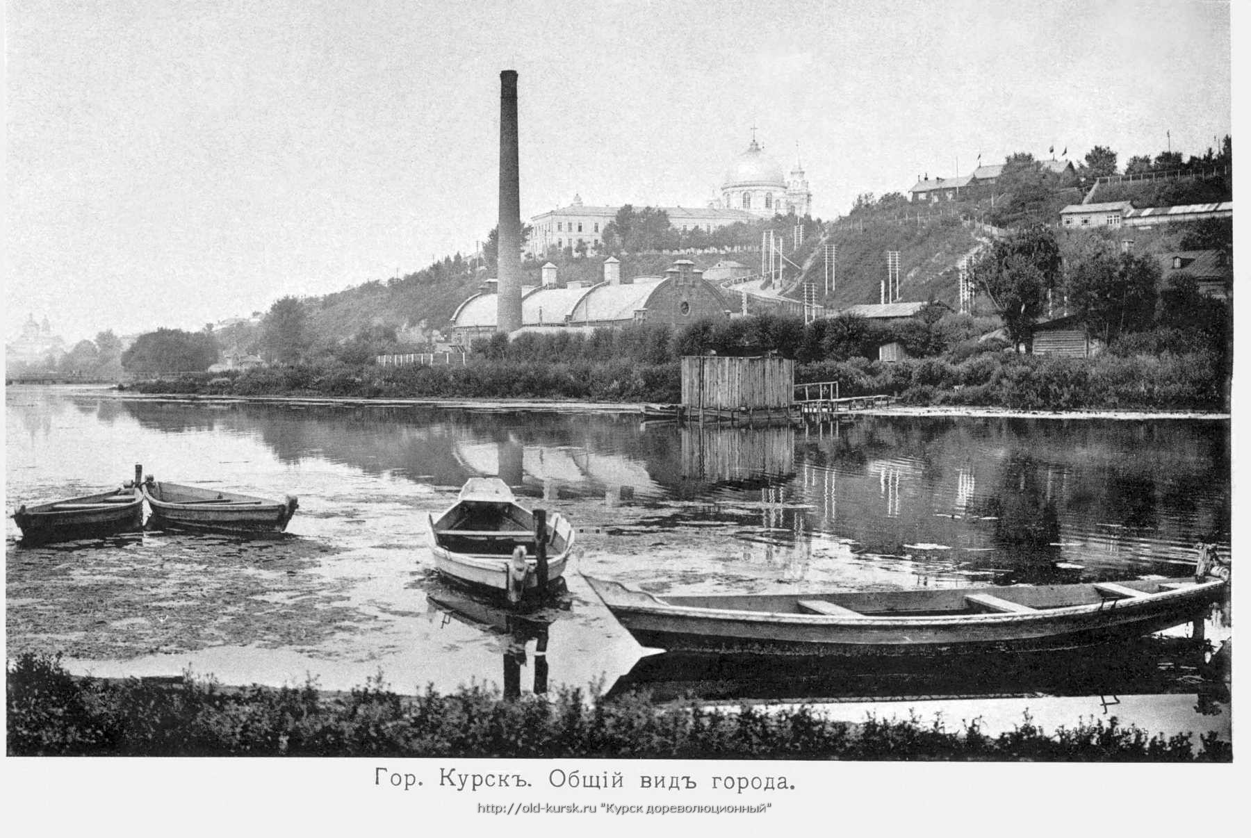 Общий вид города. Лодки у стрелецкого берега, купальни - у городского. За рекой электрическая станция, Знаменский собор и губернское правление. Слева, у обреза, едва заметна Троицкая (нижняя) церковь и ее отражение в воде