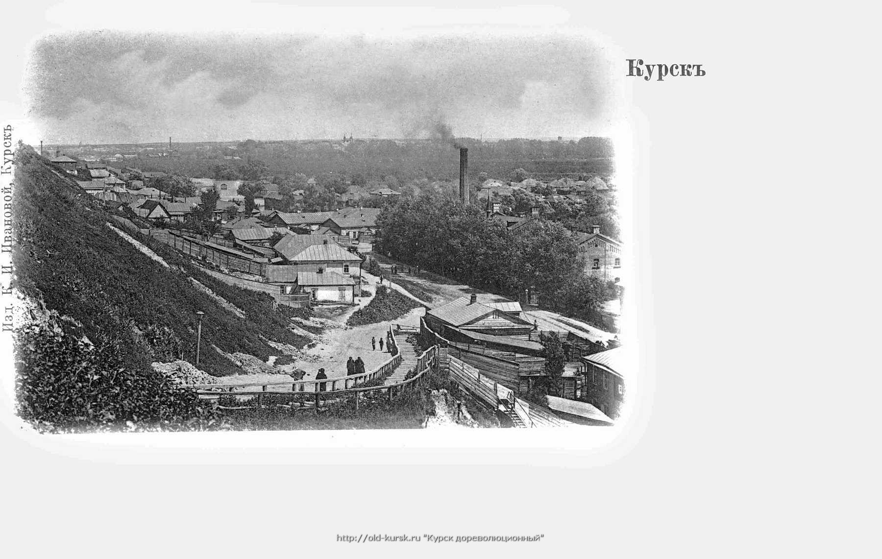 Курск.Иорданский спуск. По его левой стороне вырыты ямы для установки столбов электропередачи. Следовательно, негатив 1901 г., когда была введена в действие электростанция для освещения города, построенная на берегу Тускари. По правой стороне идет огороженный деревянный водоспуск. За деревьями водоподъемное здание Общества водоснабжения и газоосвещения с дымовой граненой трубой