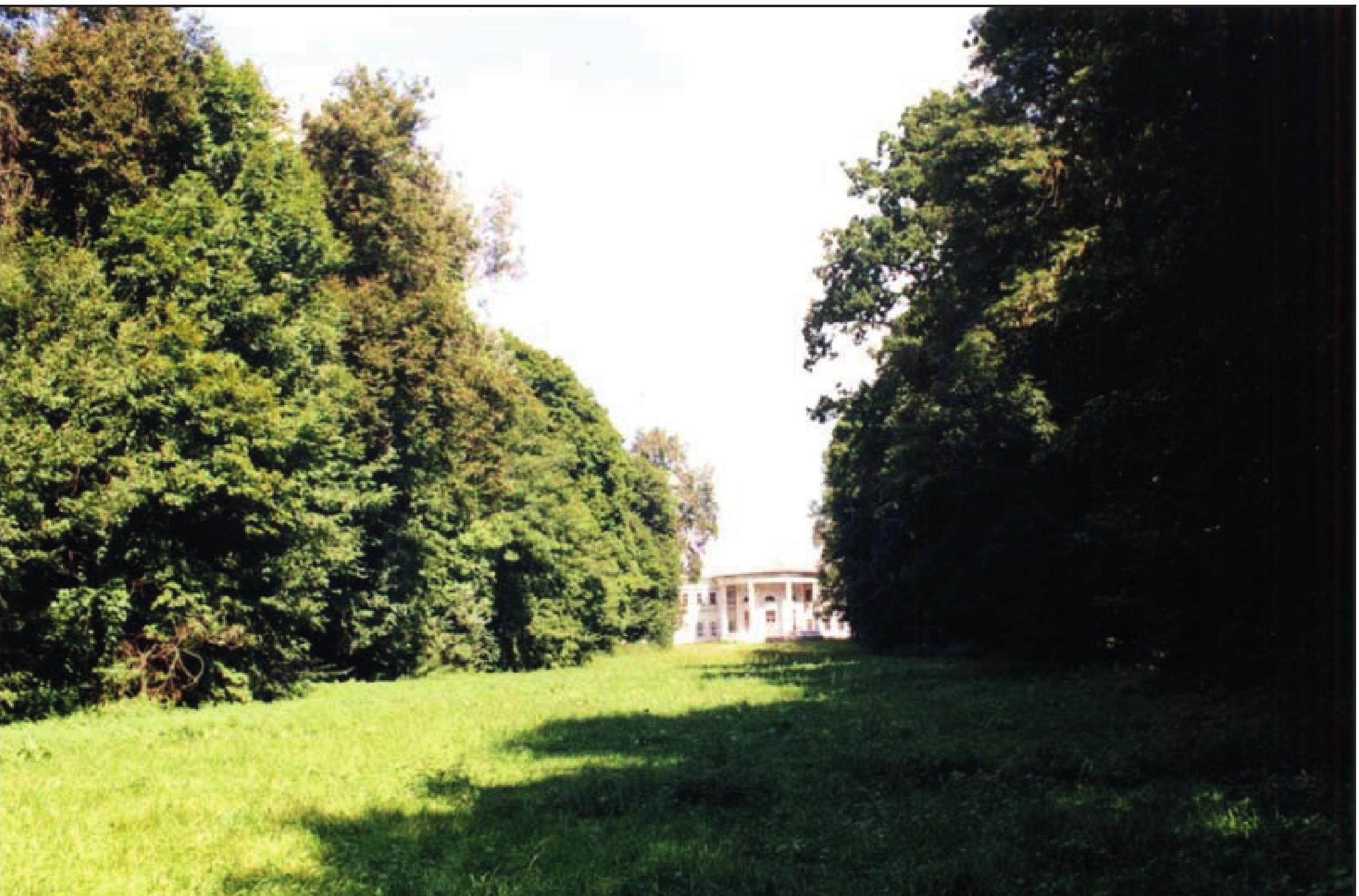 По сторонам главного дома, предположительно, существовали флигели, образующие с северного въезда в усадьбу парадный двор курдонёр. Главный дом ориентирован по основной планировочной оси парадной подъездной аллеи с севера и широкого паркового партера с юга. Парадный курдонёр был обозначен круглой клумбой и круговым объездом перед главным фасадом. Архитектура здания созвучна времени стилизаций эклектичного историзма в неоренессансных и неоклассицических формах вероятной его реконструкции в 1870-1880-х годах. Здание кирпичное, двухэтажное на подвале, накрыто поздней вальмовой крышей под железным покрытием (цветная вклейка, рис. XXXII). Компактное объемно-пространственное решение равновесного объекта стремится к симметрии. К основному прямоугольному двухуровневому на подвалах объему здания примыкает двухсветная полуротонда (цветная вклейка, рис. XXXIII). Здание имеет два парадных продольных фасада, выходящих на парковый партер с севера и на юг в сторону запруд, откуда организованы его основные входы. В плане объект имеет основную прямоугольную композицию с коридорной системой планировки. Продольные несущие стены делят план здания на две равные части и организуют основной продольный коридор, где организованы парадные лестницы дома. По центральной оси объекта с юга расположен полукруглый объем двусветного парадного зала, окруженного шестиколонной галереей (см. рис. 2). В ходе ремонтов в ХХ в. здание серьезно пострадало. К основным утратам относятся декор интерьеров, капители колони и пилястр паркового фасада, аттики, крыльца и балкон главного северного фасада.