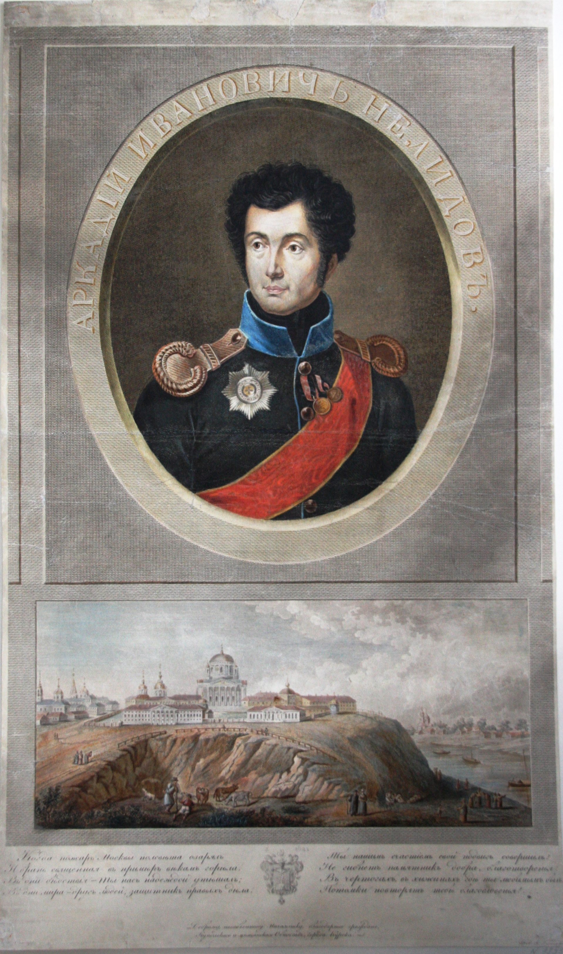 5 мая 2010 года на сайте была опубликована статья Виктора Склярука "ГОРОД КАК НА ЛАДОНИ И «НЕПРИЛИЧНАЯ» КОМПАНИЯ", где была опубликована гравюра А. Ухтомского 1821 года по рисунку И. Ромбауэра и портрет Аркадия Ивановича Нелидова. В настоящей статье представлена та же гравюра, но предметы форменной одежды раскрашенны художником Курского краеведческого музея в соответствии чином и званием генерал-лейтенанта, действительного тайного советника, награденного Орденом Святой Анны 1 степени, Орденом Святого Иоанна Иерусалимского, Орденом Святого Александра Невского. Лента шириной 10 см красного цвета с золотой каймой через левое плечо - полагалась к ордену Святой Анны 1 степени, который носился на правой стороне груди. ![]() Для увеличения дважды щелкните по рисунку