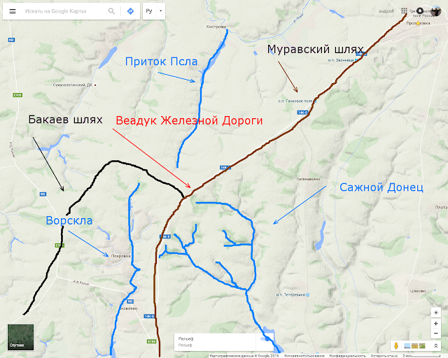 автор: А. СловохотовВ публикациях о событиях 16-17 веков в Днепро-Донецком междуречье Бакаев шлях, как ответвление Муравского шляха упоминается весьма часто. К сожалению, большинство из этих упоминаний в лучшем случае поверхностное цитирование сведений Книги Большого Чертежу, либо отрывочных свидетельств из других документов. Между тем, Бакаев шлях даже при сколь-нибудь детальном изучении оказывается чрезвычайно интересным явлением в мире степных дорог. Версии С. Ф. Платонова и Д. И. Багалея.В отечественной историографии, прежде всего усилиями таких известных историков как Д. И. Багалея и С. Ф. Платонова, прочно укоренилась мысль о том, что Бакаев шлях нельзя отыскать на карте поскольку точных сведений не сохранилось: Д. И. Багалей считал: "кроме этих трех дорог существовало множество другихъ менее важных: к несчастью мы не имеем о них таких обстоятельных сведений, как и о трех предшествующих дала нам Книга Большаго Чертежа. Таков например Бакаев шлях". С. Ф. Платонов, полагал что Бакаев шлях лежит между Сеймом и Пслом: "Насколько можно сообразить по беглым упоминаниям документов, Бакаев шлях, идя на восток между р. Сеймом и Пслом, на их верховьях сплетался своими сакмами с Муравским шляхом. На их соединении впоследствии стояла сторожа, “а видеть с тое сторожи по Муравскому и по Бакаеву шляху в поле верст с семь и до реки до Пела”. Но здесь же дороги и расходились, почему место их соединения и называлось “на Ростанех”. Бакаев шлях отходил от Муравского на северо-запад, и его направление в этой части определялось так: “сакма татарская лежит с Изюмской и с Муравской сакмы промеж Думчей курган и реки Пела к Семи пузатой в Курские места”. Насколько справедливы эти утверждения? Самая прямая из дорог.В публикации "Куда вел Муравский шлях" мы рассказывали о том, что для того что-бы дойти от Крыма до Москвы (то есть пересечь все Днепро-Донецкое междуречье) достаточно двигаться по водоразделу притоков Днепра и Дона: http://ugrim.blogspot.ru/2016/03/blog-post_92.html При этом, как это видно на карте внизу, необходимо сделать лишь одну большую петлю (она отмечена зеленым цветом) огибая верховья Сейма: ![]() Совершенно естественно попытаться избежать этого длительного огибания и найти прямой путь (на карте отмечен черным): ![]() На языке 16-17 веков это означало "прихаживать на Свиную дорогу с Бакаева шляху". Бакаев шлях шел в междуречье Псла и Ворсклы южнее линии Сейма, а Свиная Дорога в междуречье Десны и Оки севернее Сейма. Именно об этом сообщается в Книге Большого Чертежу: А тою Свиною дорогою //прихаживали [перехаживали] Белгородские Татаровя, на Рыльские, и на Карачевские, и на Болховские, и на Орловские места, Бакай [Банай] Мурза, как Польских городов не было. А прихаживали на Свиную дорогу с Бакаева шляху, а Бакаев шлях от Муравсково шляху верст с 40 к Днепру. А на Семи те Татаровя перелазили Семь реку, ниже Курска 40 верст, под Городецким городищем. И на том Татарском перевозе ныне деревни Рыльскаго уезда, а сторожа от Татар, на Городецком городище стоит из Курска. Для того что-бы осознать востребованность этого пути достаточно вспомнить, что именно в междуречье Десны и Оки (то есть на Свиной дороге) состоялось знаменитое стояние на реке Угре (1480 год). Впрочем, перейти на Свинную дорогу с Муравского шляха можно и гораздо севернее, например по Быстрому броду в верховьях Оки. Так в