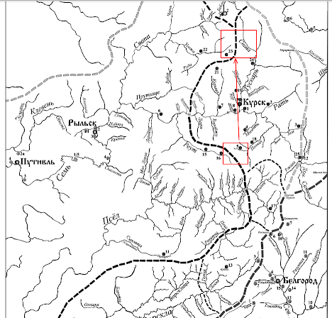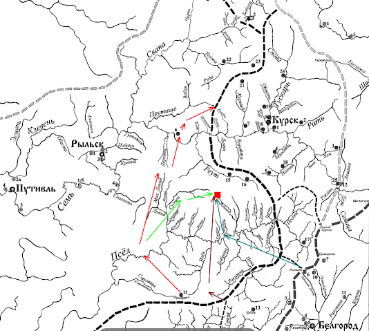 автор: А. СловохотовПеречитывая статью А. В. Зорина о Бакаевом шляхе, которую в целом считаю очень удачной, а самого автора одним из немногих живущих в современной России, кто разбирается в татарских дорогах 16-17 века я обратил внимание на один весьма важный момент, а именно как Бакаев шлях пересекает линию Верхнего Псла. ![]() Схема №1. Верхний Псел - это ключевой регион всего левобережья Днепра поскольку с одной стороны через него проходят важные дороги на север (с форсированием линии реки Сейм), но еще большее значение Верхний Псел имеет потому что выдвинут в единственный проход в кольцо рек Ворскла, Сейм, Днепр - который является как-бы естественной крепостью земледельцев на Левобережье Днепра. Верхнему Пслу, как ключевому региону, посвящены ряд других моих публикаций, а в этой статье мне бы хотелось поразмышлять о стратегической петле которую Бакаев шлях описывает что бы пересечь верхний Псел. Я бы назвал ее "бакаевой петлей". Для чего необходим этот манёвр? Общеизвестно что татары описывали петли для того что-бы сбить противника с толку. Однако в данном случае "татарская петля" описывается вокруг такой известной позиции как верх реки Суджи. (схема №1). Между тем именно верх Суджи можно определить как центральную позицию междуречья Псла и Сейма близь которой находится типичный топоним Высокое. Однако продолжим разбирать географию "бакаевой петли". Глядя на схему составленную А. В. Зориным несложно заметить что если провести прямую линию, которая бы спрямляла "бакаеву петлю", то она бы соединила точки отмеченные А .В. Зориным как 11 и 6 и вывела бы к верховьям северного притока реки Прутище (водораздел Прутище - Рогозна), куда и приводит Бакаев шлях. ![]() Однако прежде чем мы разберем внутренний радиус "Бакаевой петли", следует посмотреть на её внешний радиус. В ее начале хорошо видно что петля сначала форсирует приток Псла Пену, а затем приток Псла Пселец. Переправа через броды на небольших притоках позволяла избежать движения по еще большей петле. Можно назвать ее "Большой Бакаевой Петлей". Точно такой же участок в Белгородской области есть на Изюмском шляхе. Затем следует движение в ворота рек Реут и Полная вдоль течения реки Реут к переправе через Сейм. ![]() Собственно огибание верховьев реки Пена приводит к перекрестку с Муравским шляхом "росстанехом" и в источниках называется Бакаевым шляхом. Огибание же Псельца ведет к Думчему кургану и по представлениям 16-17 века это начало Пахнутцевой дороги, которая уходит через Солнцевский брод в верховьях Сейма. Если же нам надо пересечь средний Сейм западнее Курска, то никакой необходимости петлять вокруг Псельца нет, что бы выйти к верховьям Реута есть другие варианты. Теперь вернемся к внутреннему радиусу. ![]() Красная линия (путь из ворот Суровицы и Илька через Псел по западному берегу Локни через Сейм к верховьям Прутище) известна как Залоконский шлях. Зеленая линия с форсированием на устье Суджи известна как срединная Сакма. Коричневая линия опять же к верх Суджи известна как старо-посольская дорога. Темно зеленая линия к Гочево, а оттуда опять же открывается путь к верху Суджи известна как Калмацкая сакма. ![]() Добавим сюда маршрут Бакаева шляха с возможным вариантом через другие броды обозначенный фиолетовой линией. И маршрут Пахнутцевой дороги обозначенный светло-коричневым. И окажет