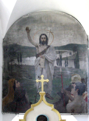 Слобода Замостье (ныне Суджанский район Курской обл. РФ) была основана как форштадт сотенного города Сумского Слободского казачьего полка - Суджи. История Спасо-Преображенского храма сл. Замостье уходит в XVII в. Согласно "Описи новопостроенного города Суджи, учиненной воеводою Герасимом Семеновичем Рагозиным в 1664 г.": "За рекой Суджею промеж реки Суджи и речки Смердицы, у Московской и Болгородской дороги …. Стоит церковь во имя Преображения Господа Бога и Спаса нашего Иисуса Христа, середь слободы; а в той слободе 182 двора, а в иных дворех еще люди не живут, строены вновь…" [4, С. 134]. Церковь была деревянной. Каменный храм в сл. Замостье был построен в 1865 г. [3, С 2], трехнефный, шестистолпный, с пятью шатровыми главами. Боковые главки храма глухие. С западной стороны к храму пристроена шатровая трехъярусная колокольня. Долгое время храм простоял нерасписанный. Судя по некоторым сохранившимся иконам, которые находились в храме до его росписи, интерьер был решен следующим образом. На фоне белых стен были поставлены иконы, некоторые из них своей формой повторяли конструктивные особенности храма. Такая икона сохранилась в северном нерасписном приделе храма. Она написана суджанским художником-иконописцем П. К. Лихиным (1879 - 1967 гг.) в 1915 г. Большеформатная икона св. Иоанна Предтечи, выполненная на холсте, полностью перекрывает арку вимы северного придела. Своим полукруглым верхним завершением, икона точно вписывается в полуциркульную алтарную арку. Росписи храма были выполнены в 1922 г. П. К. Лихиным в соавторстве с Ф. И. Нестеровым и В. С. Клименко (о чем повествует авторская надпись в алтаре). Работы над монументальными росписями не была закончена. Не расписанными остались боковые нефы храма, кроме того, две росписи были оставлены на стадии первой прописки. Вероятно причиной незавершенности росписей стала неблагоприятная политическая ситуация в стране в 20-е гг. ХХ ст.