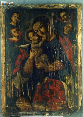 В поствизантийский период явно обозначилось влияние искусства Западной Европы на православную иконографию. А. Дюрер был первым художником Запада, который повлиял на тысячелетнюю иконографическую традицию, изменив направление влияния с Восток - Запад на Запад - Восток [14, C. 328]. С XVI в. в иконографию православных стенописей и икон постепенно проникают целые композиции западноевропейского происхождения, которые в переработанном виде стали постепенно восприниматься как изображения вполне православные. На Слободской Украине, церковная культура которой начала активно формироваться с середины XVII в., выявлен целый ряд иконографий, которые, пройдя через всю Украину, прочно утвердились на северо-востоке украинских земель. К таким иконам относятся Ахтырская [16], Лоретская [17] и Пряжевская [17] иконы Богородицы, икона Богородицы "Трех радостей" [15], а также икона Богородицы Пасовская-Цареградская. Икона Богородицы Пасовская-Цареградская приобрела почитание на землях Сумского полка, в северной части Слобожанщины (это нынешний север Сумской обл., юг Курской обл. РФ). Иконография Пасовской-Цареградской иконы не имеет исследовательской традиции, за исключением предварительных публикаций автора данной статьи, посвященных поиску аналогов и реставрации [18] (автором статьи было отреставрировано несколько икон данной иконографии сер XVIII - ХIX в.). Пасовская-Цареградская икона (ил. 2 - 13) представляет собой полуфигурное изображение Богоматери с Младенцем. Младенец изображен с правой стороны Богоматери стоящим. Левой ножкой Христос опирается на левое колено Богоматери. Правую ножку Он закинул на Ее левую руку. Создается впечатление, что Младенец как бы карабкается вверх, чтобы прильнуть к щеке Богородицы. Правой ручкой Богомладенец держит Богоматерь за подбородок. Левой рукой Богородица поддерживает Младенца под бедро, правой прижимает к себе. Богоматерь изображена с непокрытой главой. Ее красный мафорий, украшенный золотыми цветами, ниспадает вниз свободными складками. Туника глубокого сине-зеленого цвета. Младенец облачен в белые одежды. На Слободскую Украину Пасовская-Цареградская икона была перенесена в конце XVII в. Суджанский историк и краевед конца XIX в. А. И. Терлецкий [12] упоминает, что в интерьере Успенско-Архангельской соборной церкви г. Суджи находилась икона Пасовская-Цареградская "весьма древнего письма" [13, C. 106]. Можно предположить, что эта икона, вместе с другими, была перенесена в Успенско-Архангельскую церковь из упраздненного в начале XIX в. Суджанского Иоанно-Предтеченского монастыря, основанного в конце XVII в. иеромонахом Антонием (Бензой) [13, С. 90]. Вероятно, именно о. Антоний и перенес Пасовскую-Цареградскую икону на Слобожанщину. В XIX в. почитание этой иконы не ослабевает, что во многом связано с прославлением списка Пасовской-Цареградской иконы в с. Уланок Суджанского уезда. Как повествует в начале ХХ в. уланковский священик П. Чужимов [6, С. 538], Пасовская-Цареградская икона первоначально находилась в доме уланковского помещика, титулярного советника И.Ф. Никифорова и являлась собственностью рода. После чудесного исцеления через икону дочери помещика, весть о получаемых исцелениях разнеслась по окрестным селам. В 1850 г. икона была пожертвована в Уланковскую церковь сыном помещика П.И. Никифоровым [6, С. 538]. Согласно описанию, приве