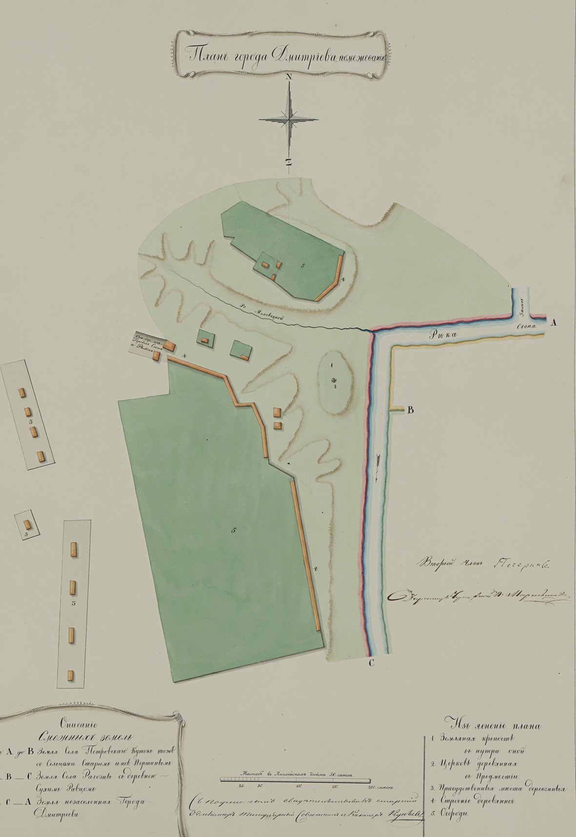 Автор: Струков ВалерийНародный бунт под предводительством Емельяна Пугачева заставил правительство задуматься о необходимости реформ в Российской империи. 7 ноября 1775 года вышел указ Екатерины II. Учреждения для управления Губерний Всероссийской Империи. [1] Во исполнение этого постановления 23 мая 1779 года вышел именной, данный сенату, указ Екатерины II.- Об учреждении Курской губернии. [2] ![]() Рис. 1. Фрагмент указа от 23 мая 1779 года Этим указом шесть ничем не выдающихся населенных пунктов переводились в статус городов. И тут завертелось: организация дворянского собрания, выбор предводителя дворянства, городничего, земского исправника, создание уездного суда, земского суда, нижней расправы, земского казначейства и т.д. А, главное, построить здания для "присудственных" мест или подыскать уже готовые; вырыть погреба для хранения денежной казны и казенного вина - в наше время это называется созданием инфраструктуры. В каждом из шести населенных пунктов инфраструктура создавалась индивидуально, скорее всего, не без помощи чиновников из губернского города. Подыскивалось удобное для застройки место, возводились деревянные строения (дешево и быстро). Желательно, чтобы это удобное место оказалось рядом с церковью, но не обязательно. Если и применялась планировка, то только для уездного административно-хозяйственного квартала. В 1784 -1785 годах будут утверждены "прожектированные" планы застройки городов Курской губернии, на которых черной тушью пунктирными линиями указаны объекты "как они есть". Копии этих планов впоследствии были опубликованы [3] и мы можем проанализировать, как создавалась инфраструктура новых уездных городов. В 1786 году в Москве была издана работа "Описание Курского Наместничества" прокурора Верхней Расправы Сергея Ларионова - мы будем ею пользоваться. [4] Город Тим![]() Рис. 2. Фрагмент плана города Тим по межеванию [5] Что же мы видим на плане: в нижней трети некий огороженный с трех сторон участок со строениями. Справа текст с изъяснениями плана: "1. Земляной вал и в округе оного рогатки. Внутри оного: 2. Городнической дом. Присудственные места: 3. Городническое правление, 4. Уездный суд, 5. Нижней земской суд, 6. Уездное казначейство, 7. Козарма для содержания колодников. В предместии оного 10. Соленой анбар, 11. Два казенныя погреба в которых хранятся денежная казна и казенное вино." Ларионов описывает город Тим так: "Не разделяется еще онъ на части за малымъ разпространеніемъ его, укрепленій не имеетъ въ себе. Изъ улицъ лучшая есть одна Курская, пути изъ него въ смежныя съ нимъ города въ Курскъ, Обоянъ, Карочу, Старой Оскол и Щигры. Жителей въ Тиму; г. членовъ и съ приказными по Наместничеству 58, особо при должностяхъ 18, воинской команды 34, и того службою обязанныхъ 100 человекъ. Священно и церковно служителей 10, купцовъ 5, мещанъ 6, однодворцовъ 786, крестьянъ разныхъ 117, всего разнаго сего званія 935 душъ. ремесленниковъ: кузнецовъ 6, портныхъ 8, плотниковъ 10, живописецъ 1, и того 25 человекъ. Строеніе въ городе все деревянное; а имянно церквей 2, казенныхъ разныхъ корпусовъ 17, приватнаго, домовъ дворянскихъ 13, церковничьихъ 7, приказныхъ 4, протчихъ всехъ 314, и того вообще 338, трактиръ 1, харчевня 1, кузницъ 4, питейныхъ домовъ 2, мельницъ, водяная 1, ветреная 1. Городъ сей занииаетъ пространства въ длину 1 версту и 300 саженъ, поперекъ же верста и 100 саженъ; во ок
