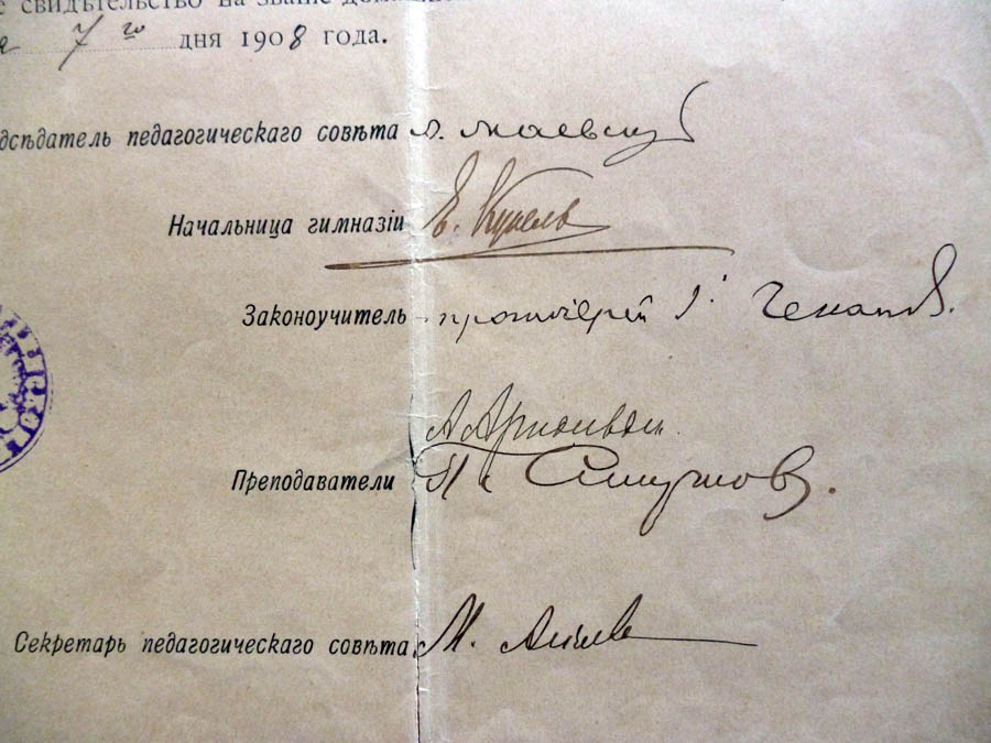 ФОТОГРАФИИ ОТ НИКОЛАЯ ДМИТРИЕВИЧА ВОРОБЬЕВА из г.ИВАНОВАавтор: Тамара КоленкоБабушка Н.Д.Воробьева: ЕМЕЛЬЯНОВА ЗИНАИДА КОНСТАНТИНОВНА. Закончила Мариинскую женскую гимназию ![]() Для увеличения щелкните по фотографии Выпуск Мариинской женской гимназии в июне 1907 года: ![]() Для увеличения щелкните по фотографии Предположительно класс в котором училась Емельянова Зинаида: ![]() Для увеличения щелкните по фотографии Фрагмент аттестата Мариинской женской гимназии выданный Емельяновой Зинаиде: ![]() Для увеличения щелкните по фотографии Автографы руководитетей: ![]() Для увеличения щелкните по фотографии Прислала Тамара Анатольевна. E-mail:toma-kolenko@mail.ru |